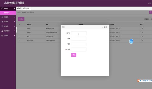 系统管理:管理员列表,包括用户名信息、邮箱、密码等信息。